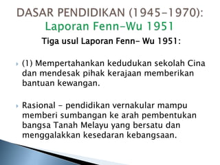 Bahasa Kebangsaan Bahasa Melayu berfungsi sebagai bahasa pengantar di semua peringkat sekolah iaitu SK SMK. Oleh itu penyata ini memainkan peranan yang sangat penting dalam perkembangan kurikulum pendidikan negara hingga kini sama ada sekolah rendag mahupun sekolah menengah. Kesan laporan fenn wu.