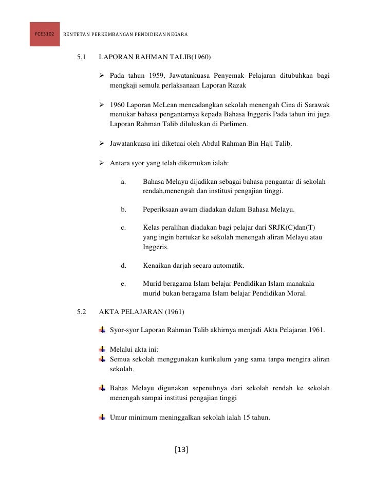 Komuniti cina dan Tamil menolak usul tersebut kerana akan menggugat bahasa dan budaya mereka. Laporan Abdul Rahman Talib 1960 Laporan Talib yang diperakukan dalam Akta Pendidikan 1961 telah mengabdikan cita-cita yang terkandung dalam Laporan Razak dan. Semua calon mesti lulus Bahasa Melayu sebelum masuk ke sekolah menengah.